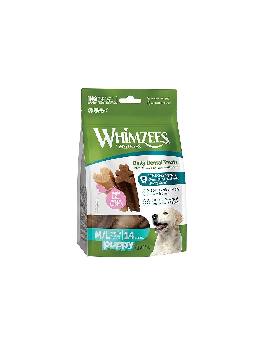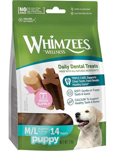 WHIMZEES per cuccioli contribuisce a ridurre la placca e il tartaro, favorisce la salute delle gengive e riduce l'alito cattivo